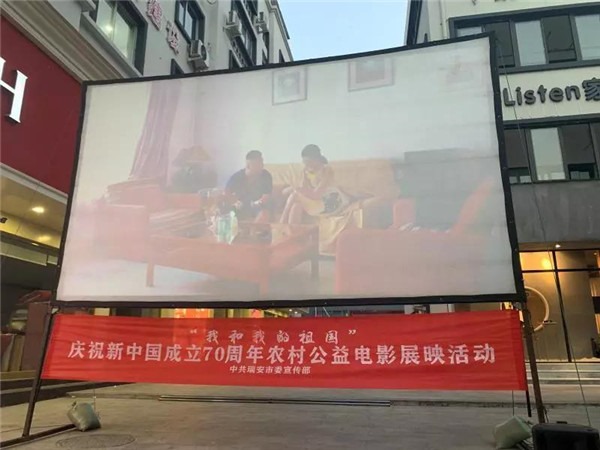 为推动瑞安市红色电影宣传教育活动,隆重庆祝中华人民共和国成立70周年,瑞安市积极探索新时代公益电影放映新模式,积极组织公益红色电影放映“八进”(进机关、进军营、进学校、进企业、进园区(街区)、进海岛、进敬老院、进工地)活动,成为庆祝新中国成立70周年活动的亮点之一。本次“八进”活动播放影片有《建国大业》《红海行动》《战狼》《咱们村的文化礼堂》等26部红色影片,受到广大基层群众的好评和点赞。活动将送红色电影1700场次,自8月中旬以来,已经放映1381场次,观影人数达17.9万多人次,成为新时代巩固和拓展农村宣传舆论阵地的新举措。